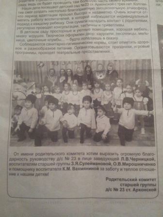 От имени нашей семьи выражаем благодарность «Детскому саду № 23 ст. Архонская» в лице заведующей Людмилы Викторовны Черницкой за внимательное и профессиональное отношение к детям. Особенно благодарим воспитателей средней группы: Наталию Александровну Петрюк и Наталью Николаевну Петрина.